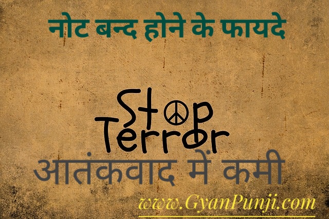 जो आतंकवाद देश के अंदर है या बाहर भी है यानी कि जो आतंकी पहले भारतीय नोटों पर निर्भर थे, अब वह आतंकवाद कम होगा क्योंकि उन आतंकियों को भुगतान भारतीय मुद्रा के द्वारा किया जाता था ,जिससे अब उनके नोट सिर्फ एक कागज़ का टुकड़ा बनकर रह जाएंगे। क्योंकि वह लोग अपने नोट बदलवा नहीं पाएंगे और फिर वह सिर्फ एक कागज़ का टुकड़ा बनकर ही रह जाएंगे।
