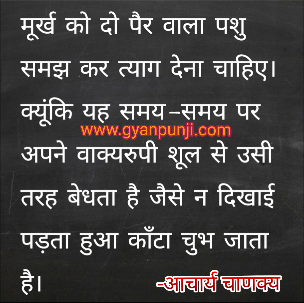 मूर्ख को दो पैर वाला पशु समझ कर त्याग देना चाहिए। क्यूंकि यह समय-समय पर अपने वाक्यरुपी शूल से उसी तरह बेधता है जैसे न दिखाई पड़ता हुआ काँटा चुभ जाता है।