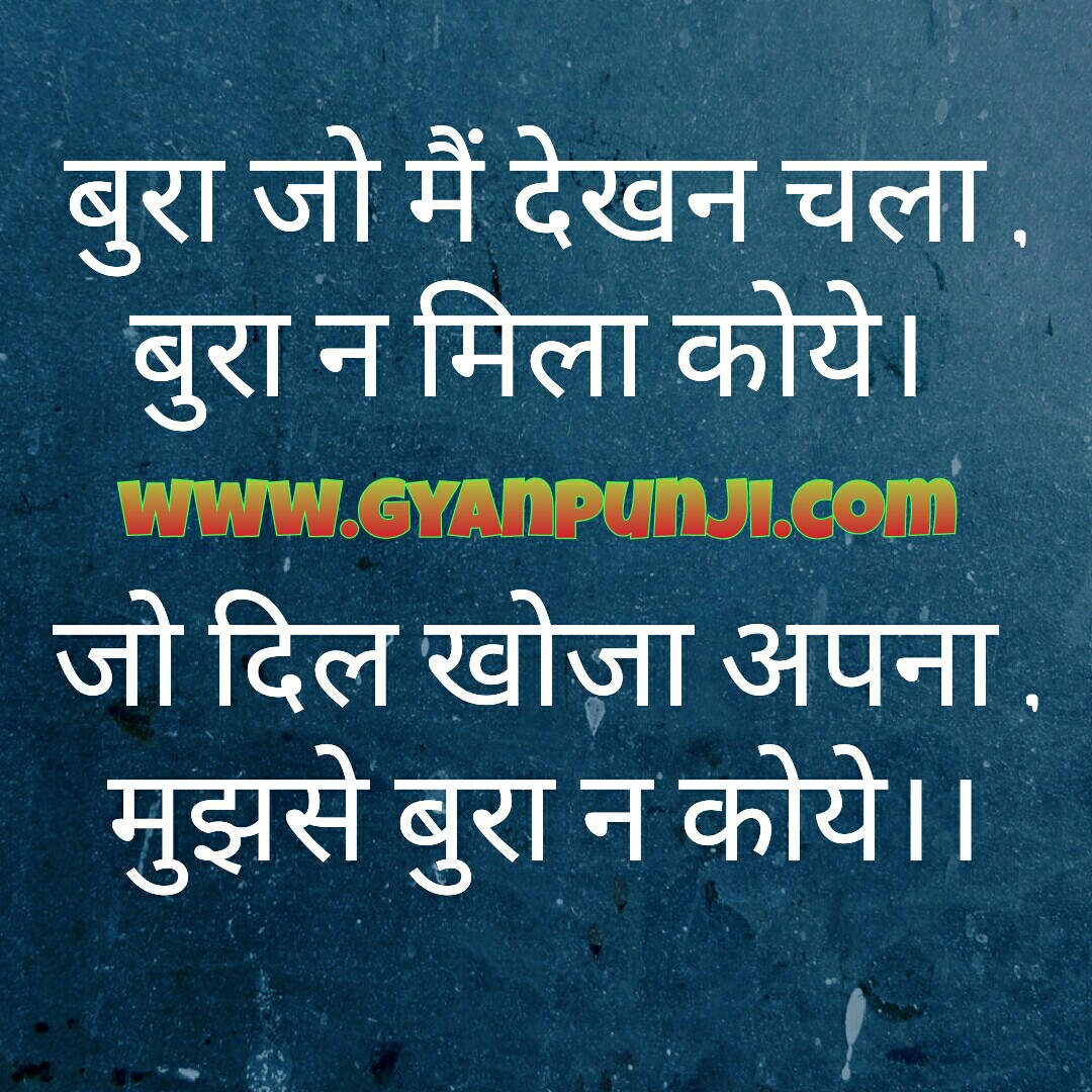 इसीलिए कबीर जी ने कहा है कि बुरा जब मैं देखने चला ,मुझे कोई भी व्यक्ति बुरा नहीं मिला। क्यूंकि हर एक इंसान में कुछ-न-कुछ अच्छाई होती ही है और उन्होंने उनकी अच्छाई को ही देखा ,उन्हें कोई भी बुरा नहीं मिला। और आगे कहते है कि जब अपना ही दिल खोज तो उन्हें अपने आप से बुरा कोई भी नहीं लगा। ऐसा उन्होंने इसलिए कहा क्यूंकि यह बुराई का ही भाव है जोकि किसी दूसरे में बुराई को ढूंढता है।